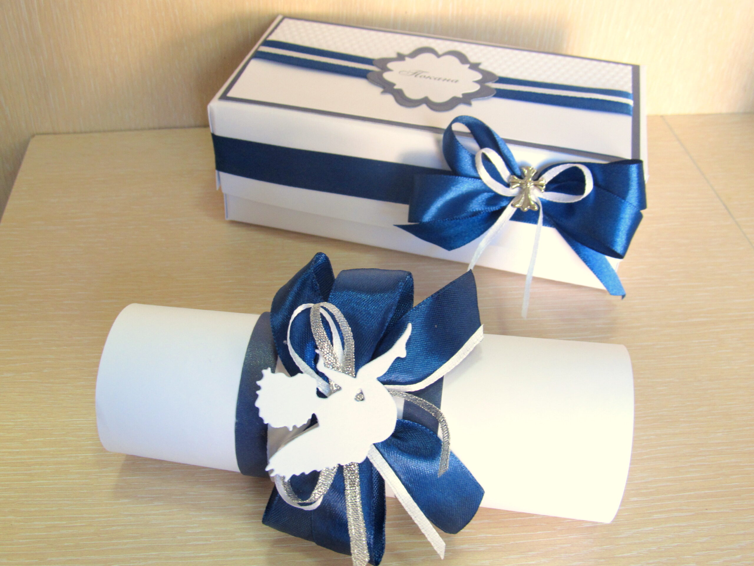 Елегантна покана в кутия, подходяща за Кръстник/Кръстница