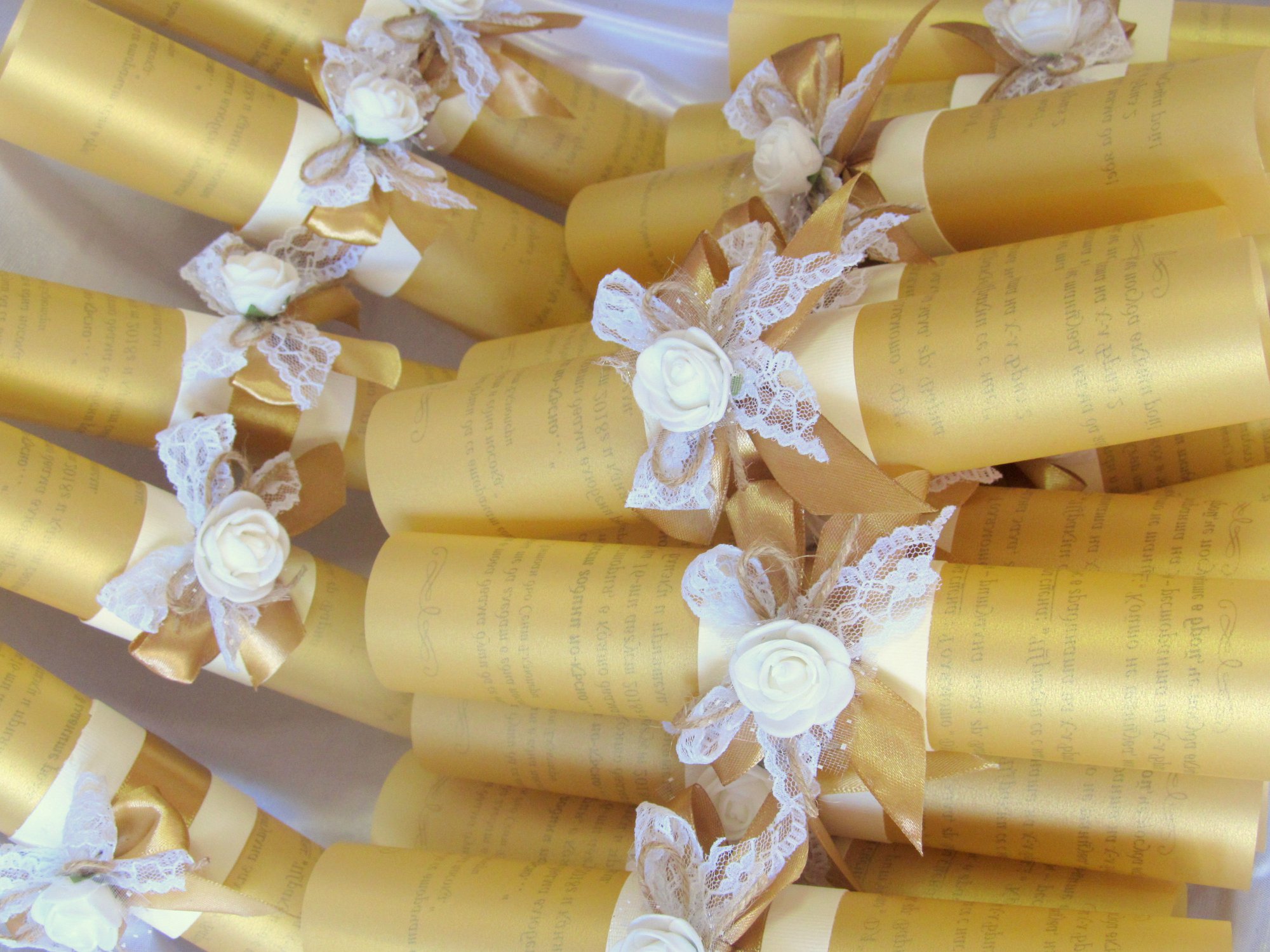 Красива и стилна покана за сватба, отпечатана върху златист паус. Декорацията включва златиста сатенена панделка, дантела, канап, силиконова розичка.