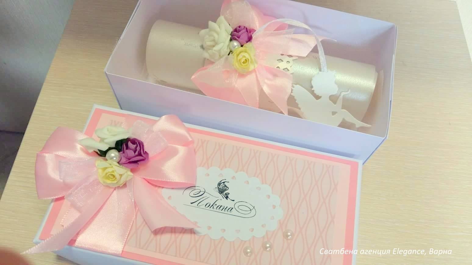 Официална, ръчно изработена покана-папирус, в кутия. Текста е отпечатан върху оризова хартия.